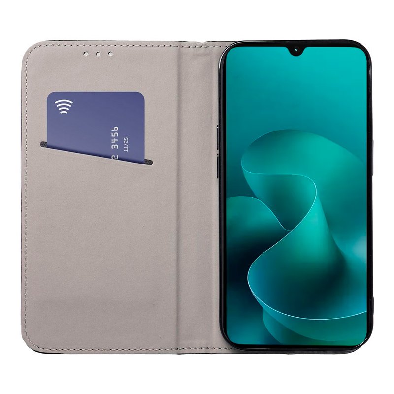Side book-type opening. It incorporates a specific casing for the smartphone model, to embed it and leave it perfectly fitted.